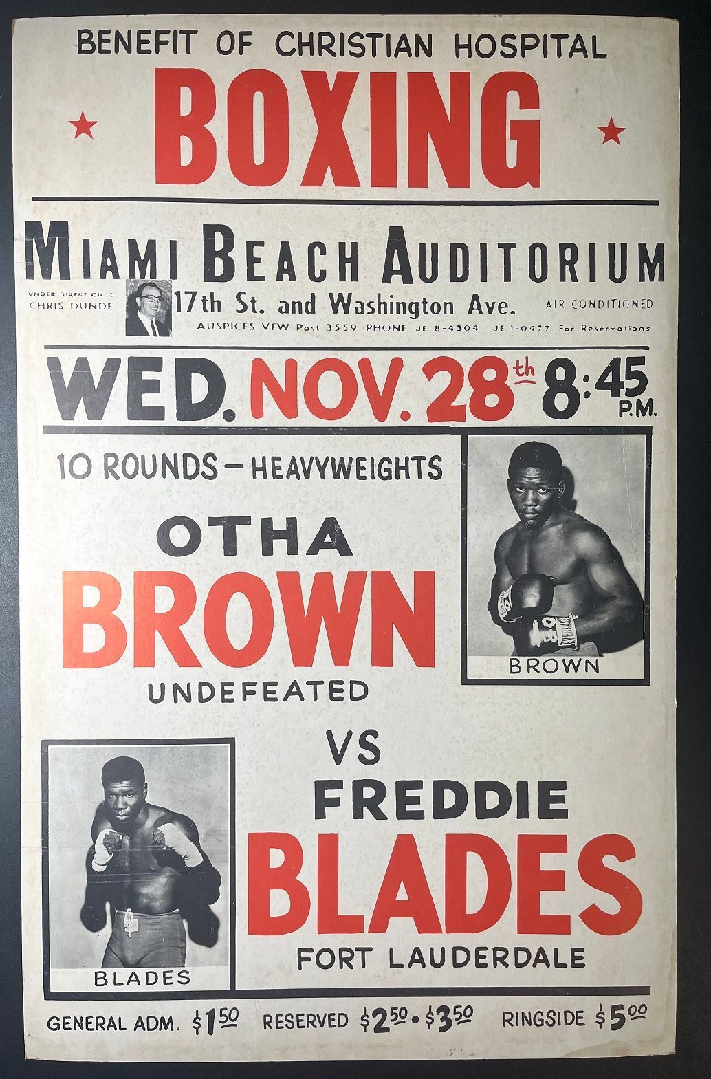 1962 OTHA BROWN vs FREDDY BLADES Vintage Onsite Boxing Poster 14x22 Miami Beach, Florida