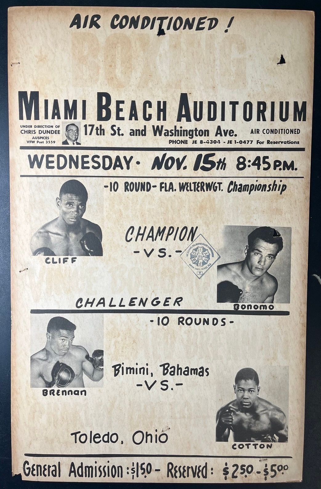 1961 VINCE BONOMO vs SUGAR CLIFF, CHARLIE COTTON vs GOMEO BRENNAN Vintage Onsite Boxing Poster 14x22 MIAMI BEACH, FLORIDA